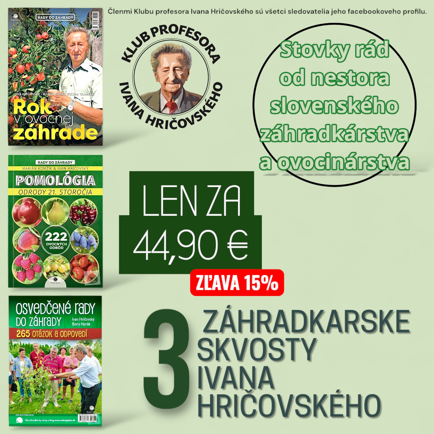 Na trh prichádza kniha nestora slovenského ovocinárstva a záhradníctva profesora Ivana Hričovského (23.1.1932 - 2.7.2024), jeho dlhoročného vydavateľa a spolupracovníka Borisa Horáka a odborníka na biologickú ochranu Zoltána Tamašeka. Publikácia, ktorá by nemala chýbať v knižnici žiadneho skúseného i menej skúseného záhradkára u nás. Nielenže prináša mnoho praktických rád do záhrady, ale chronologicky upozorňuje na nevyhnutné kroky pri pestovaní ovocných stromov a drobného ovocia a ich ochrane.